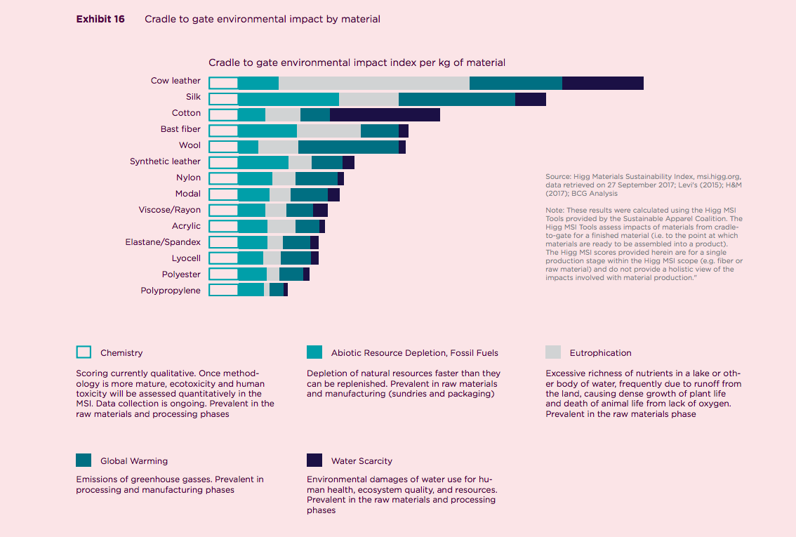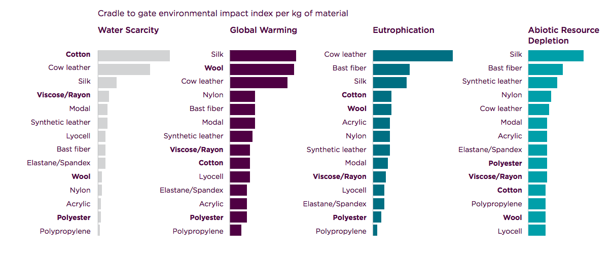 The repercussion of leather on the environment is quite significant. According to the Sustainable Apparel Coalition's "The Higg Index" the impact of most leathers is set at 159 points while other materials such as polyester or cotton have a score of 44 and 98 respectively. This score for leather is mainly because of the effect of global warming, pollution and the large amount of water used.