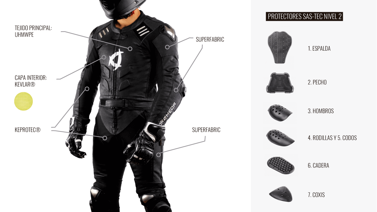 Tanto las protecciones como los materiales empleados, son los más avanzados del mercado. Por ejemplo, el tejido principal hecho de polietileno ultra-resistente,cuesta 3 veces más que el cuero.