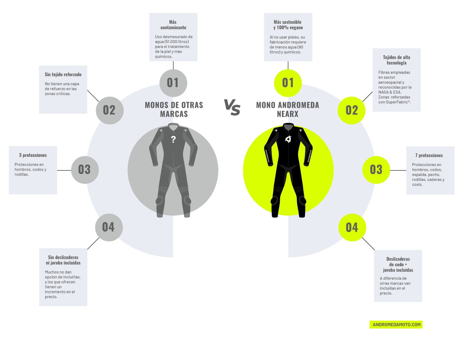 Andromeda nace como una marca deportiva de primer nivel, por lo que le damos más importancia a la calidad que a la cantidad. En el mercado se pueden encontrar monos de moto muy económicos, pero siempre hay que fijarse en las características. El mono NearX está en la liga de los monos premium que ofrecen las más altas prestaciones.