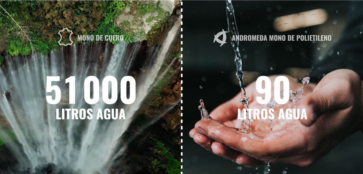 Por contra, en la fabricación de nuestro tejido sólo se gastan 30 litros por cada kilo. Es decir, 566 veces menos. Podemos ver la comparación en la siguiente imagen, teniendo en cuenta que un mono de cuero requiere aproximadamente 3kg.