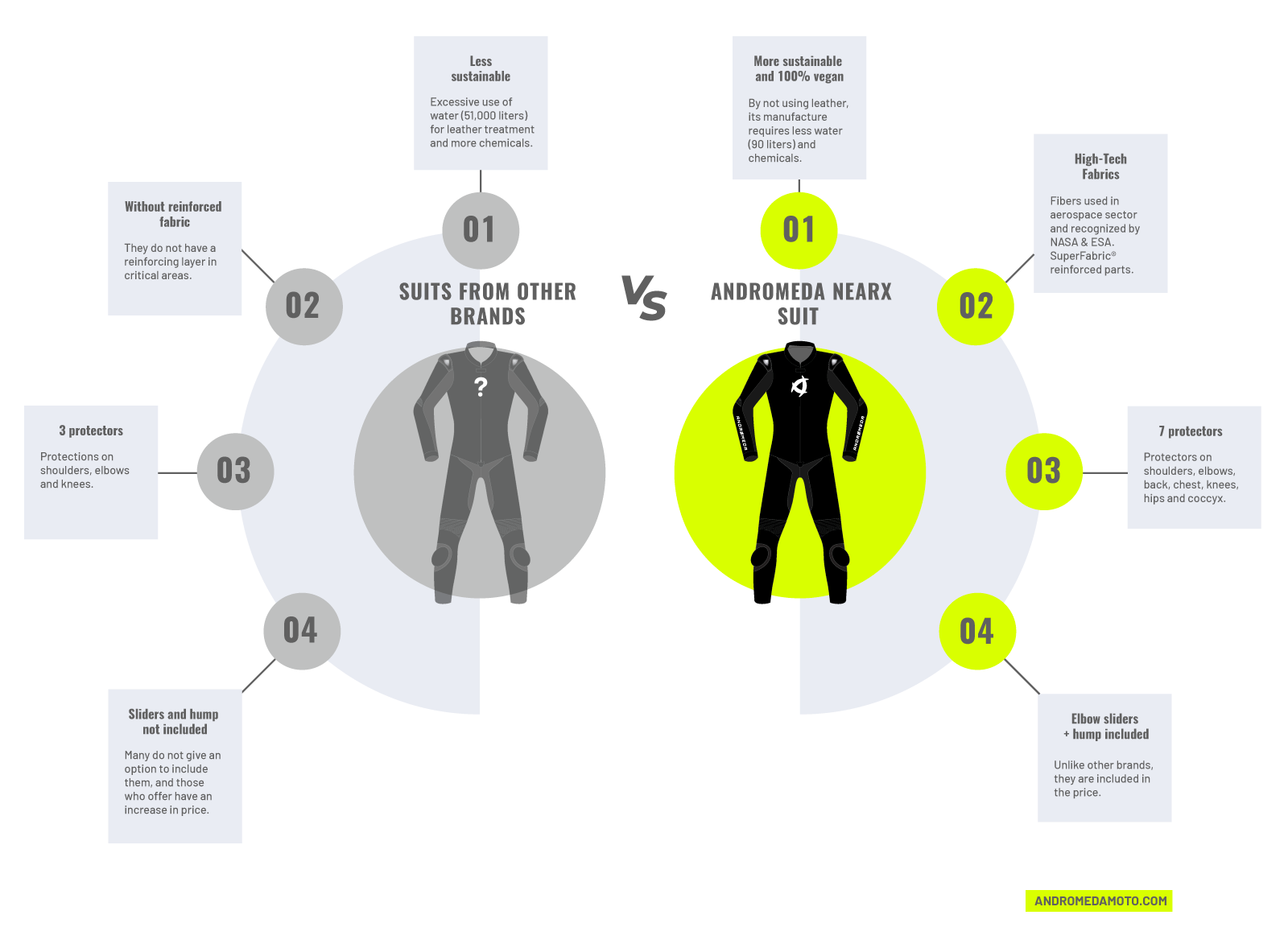 Andromeda was born as a first level sports brand; therefore, we give more importance to quality than quantity. You can find very inexpensive motorcycle suits on the market, but you should always look at the features. The NearX suit is in the league of premium suits that offer the highest performance.
