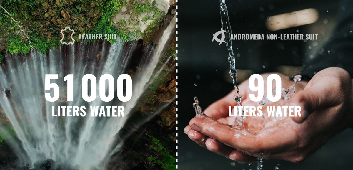 On the other hand, in the manufacture of our non-leather fabric only 30 liters are used per kilo. That is, 566 times less. We can see the comparison in the following image, considering that a single leather suit requires approximately 3kg.
