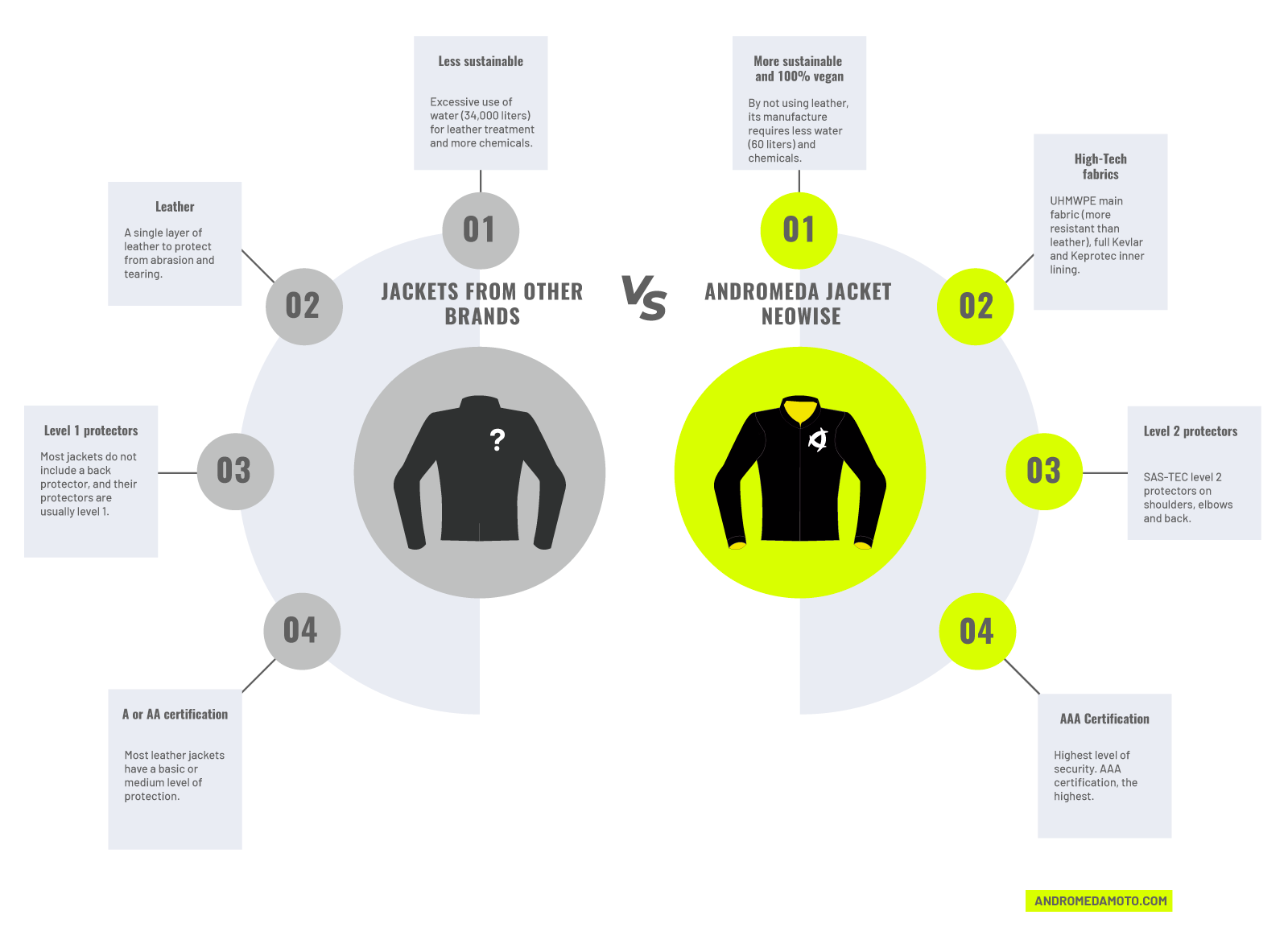 The Neowise is the most advanced non-leather motorcycle jacket and the most sustainable on the market. It uses 566 times less water than traditional leather jackets, so what are you waiting for to try out the motorbike clothing of the future?
