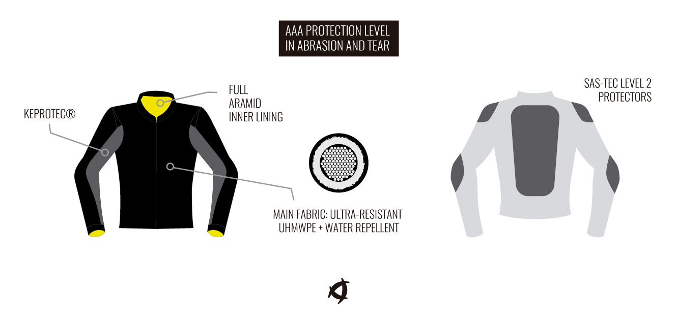 Its top quality construction and the quality of the materials make this jacket one of the safest on the market. To achieve the maximum AAA certification, we have spared no expense in using the highest quality fabrics: aramid inner lining that completely covers the jacket (not just in some areas like most other garments). Ultra-hardwearing UHMWPE polyethylene, which gives it a leather-like appearance, being more flexible, lightweight and with a water repellent finish. The arms are pre-curved for a natural riding position, and also have Keprotec for superior flexibility.